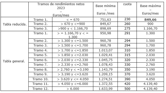 Estos deberán hacer una previsión de los ingresos y los gastos del ejercicio, con el objeto de ir adaptando su cuota, según lo que deben cotizar, en base a la tabla general fijada en la respectiva Ley de PGE que constará de una base de cotización mínima mensual y una base máxima mensual por cada tramo de rendimientos, si bien con la posibilidad de elegir la base de cotización dentro de una tabla reducida, cuando prevean que sus rendimientos van a ser inferiores a la base mínima del tramo 1 de la tabla general.